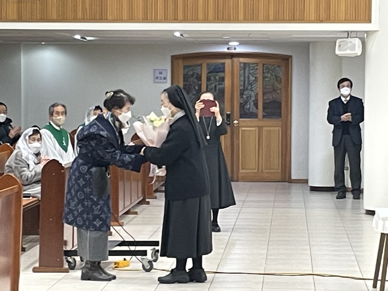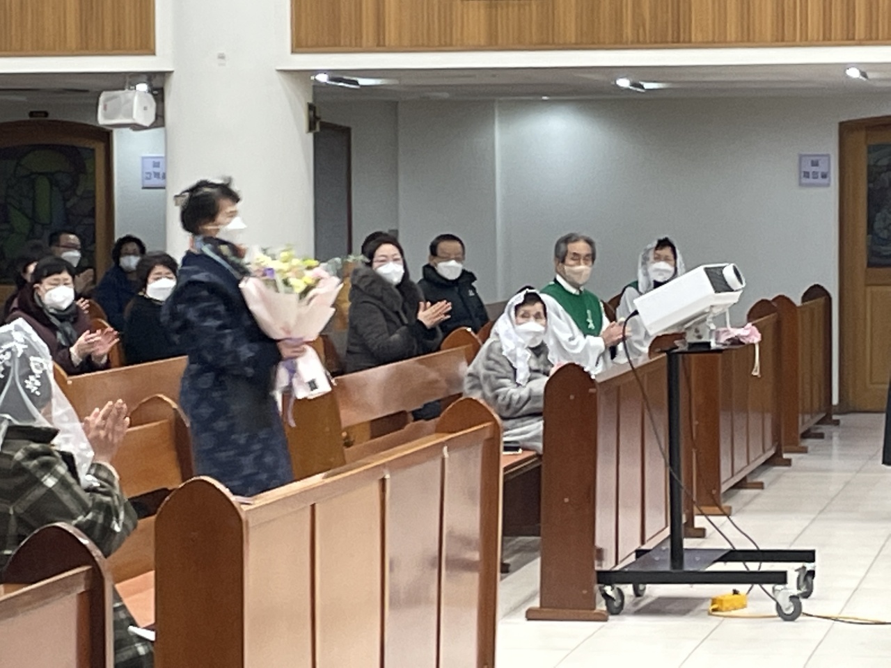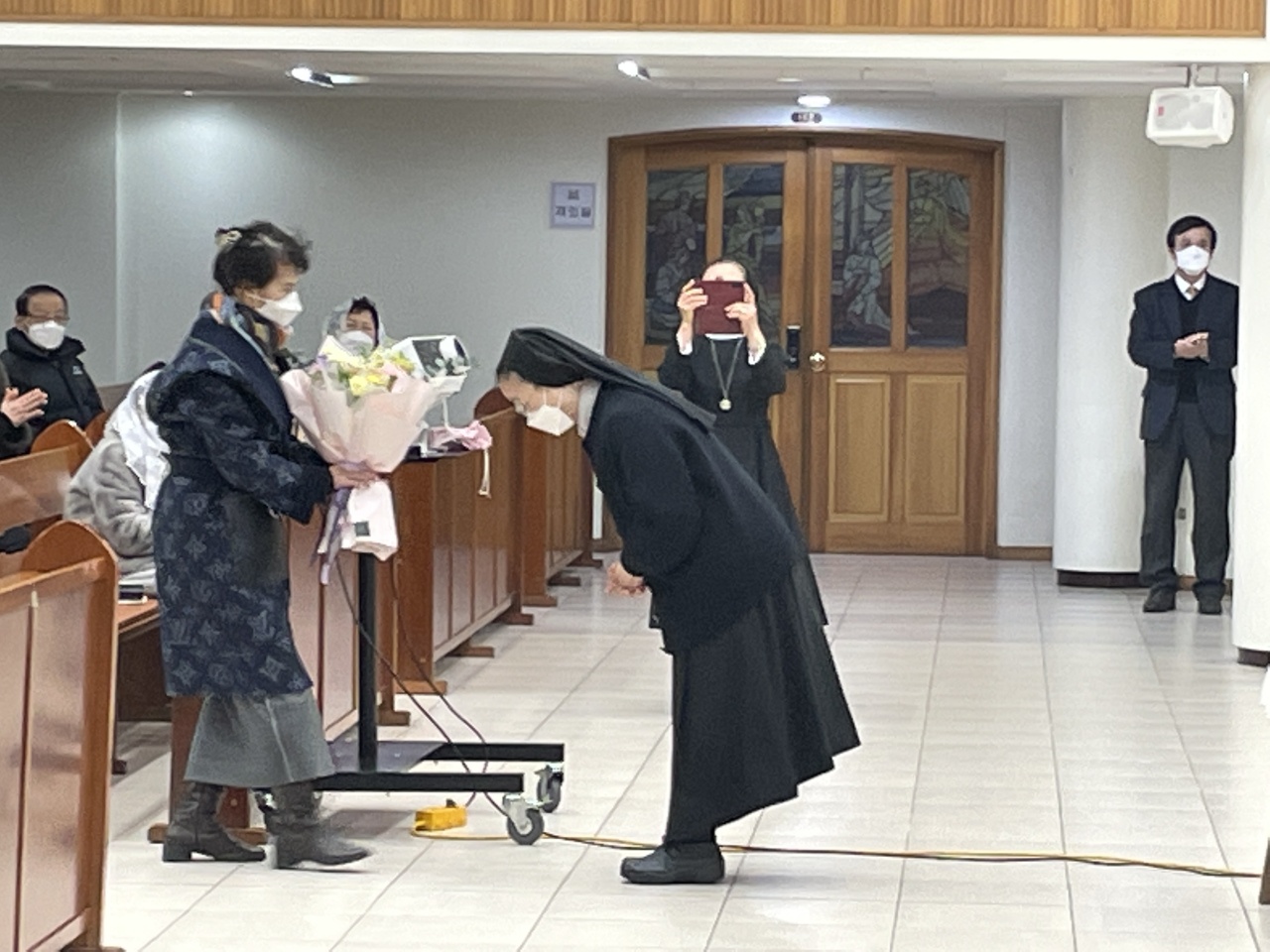 주임신부님 교중 미사후 환송식이 있었습니다. 총회장님의 환송인사와 부회장님의 꽃다발 증정이 있었습니다.