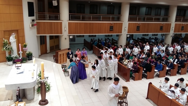 이어서, 모든 신자들이 불을 밝힌 초와 예물을 봉헌하고