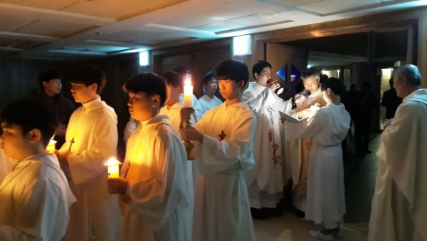 어둠 속에서 사제단과 복사단의 행렬과 함께