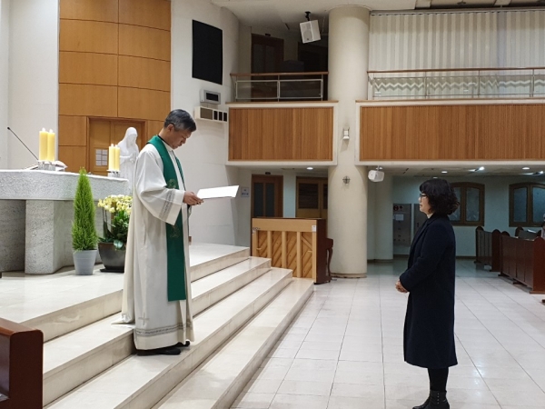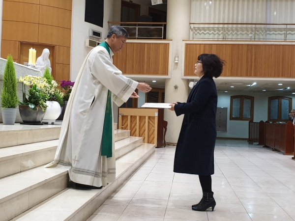 2019년 2웡17일 교중미사후 정연정(디모테오)신부님 집전하에 청소년분과장 이양숙(아녜스) 임명장수여식이 이어졌습니다.