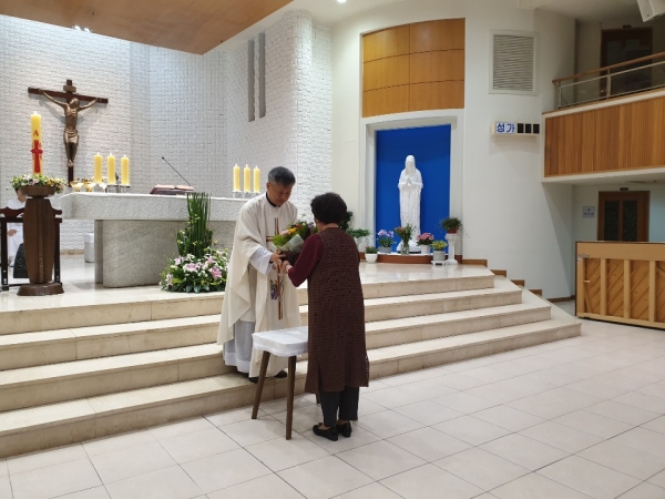 축하 안에서 성모삐에따스 성가에서 축하 곡이 흐르는속에 한화자노엘라 여성 총 구역장님께서 축하 꽃바구니 전달식이