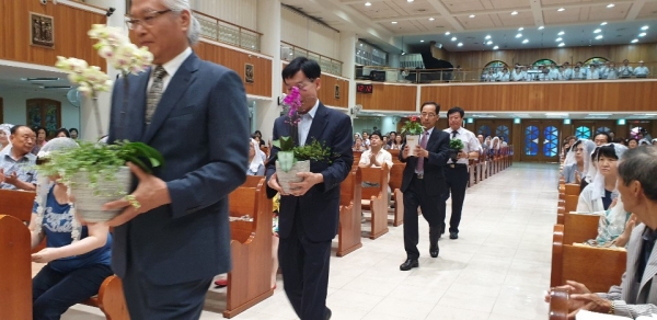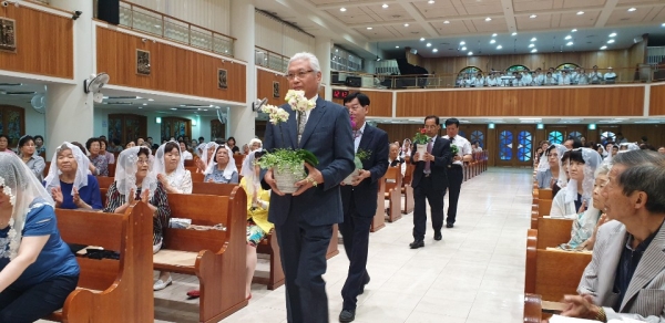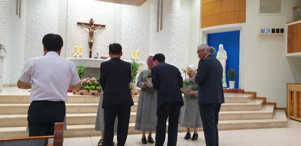 분과장들이 꽃화분을 준비하여 네 분의 수녀님분께 증정식과 축송이 이어졌습니다. 원장수녀님