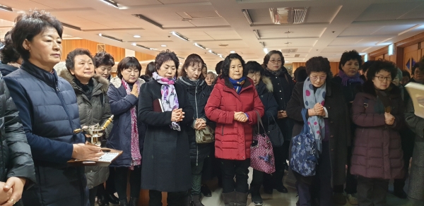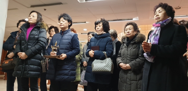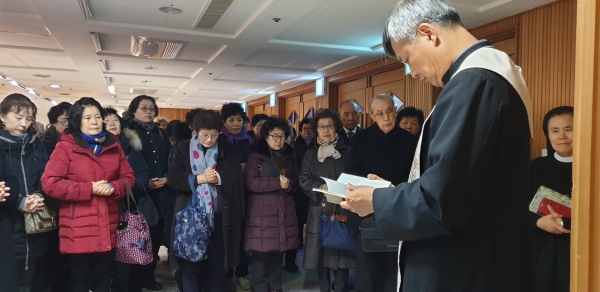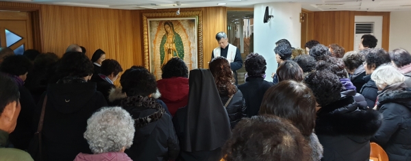 12월12일 평일 미사후 정연정디모테오 신부님께서 대성전 입구에 <과달루페 성모화 >를 많은 신자분들 속에서