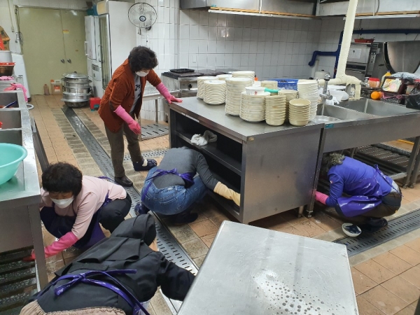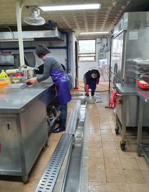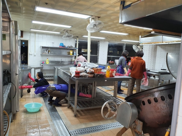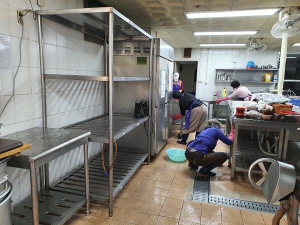청소을 수녀님 과 분과장들이 그 안에 고여있는 오염된 물을 일일이