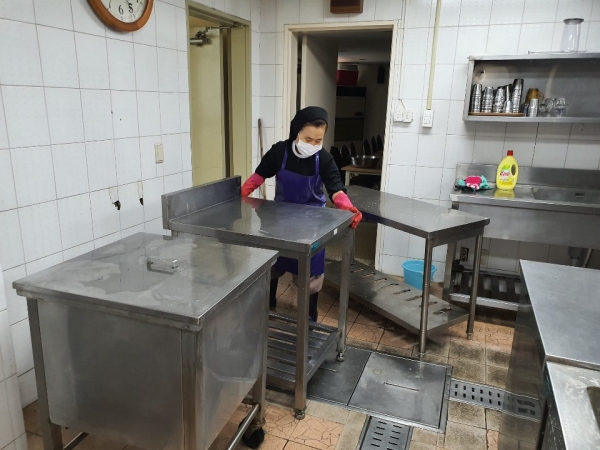 놓인 물건들을 직접 하나 하나 옮겨가면서 청소를 하고 또 주방 바닥에
