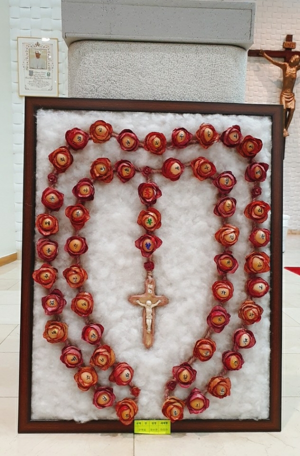 묵주알을 줄에 연결하여 이어준 뒤에 본드로 하나하나 붙인다.