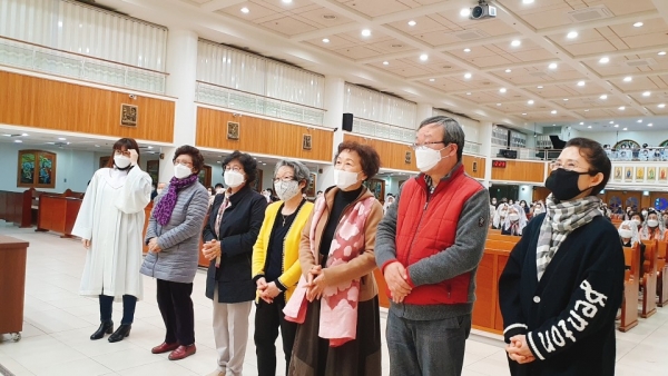 미사가 재개된 후 첫 부활 제3주일 미사가 신자들과 정연정디모테오 신부님 , 임덕일 신부님과