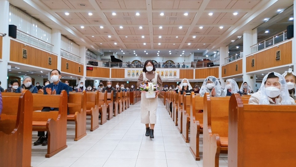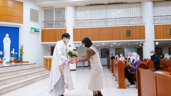 성가대 축하송 이어 이양숙아녜스 청소년분과장 꽃바구니 증정식 이후 보좌신부님