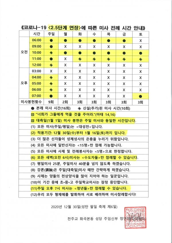 코로나-19 <2.5단계 연장>에 따른 미사 전례 시간 안내