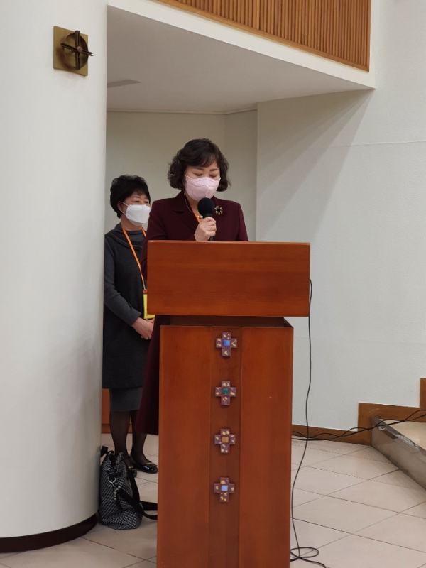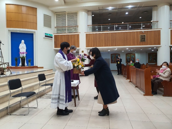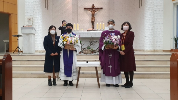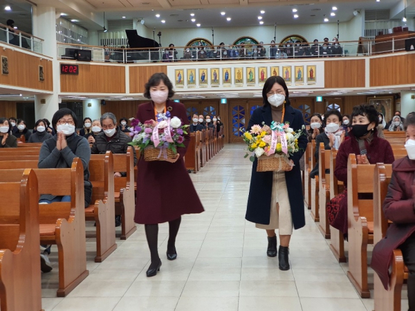 두 분의 교중미사 집전 후 환영식이 이루어 졌습니다. 김복희레오나 (총회장) , 이양숙아녜스