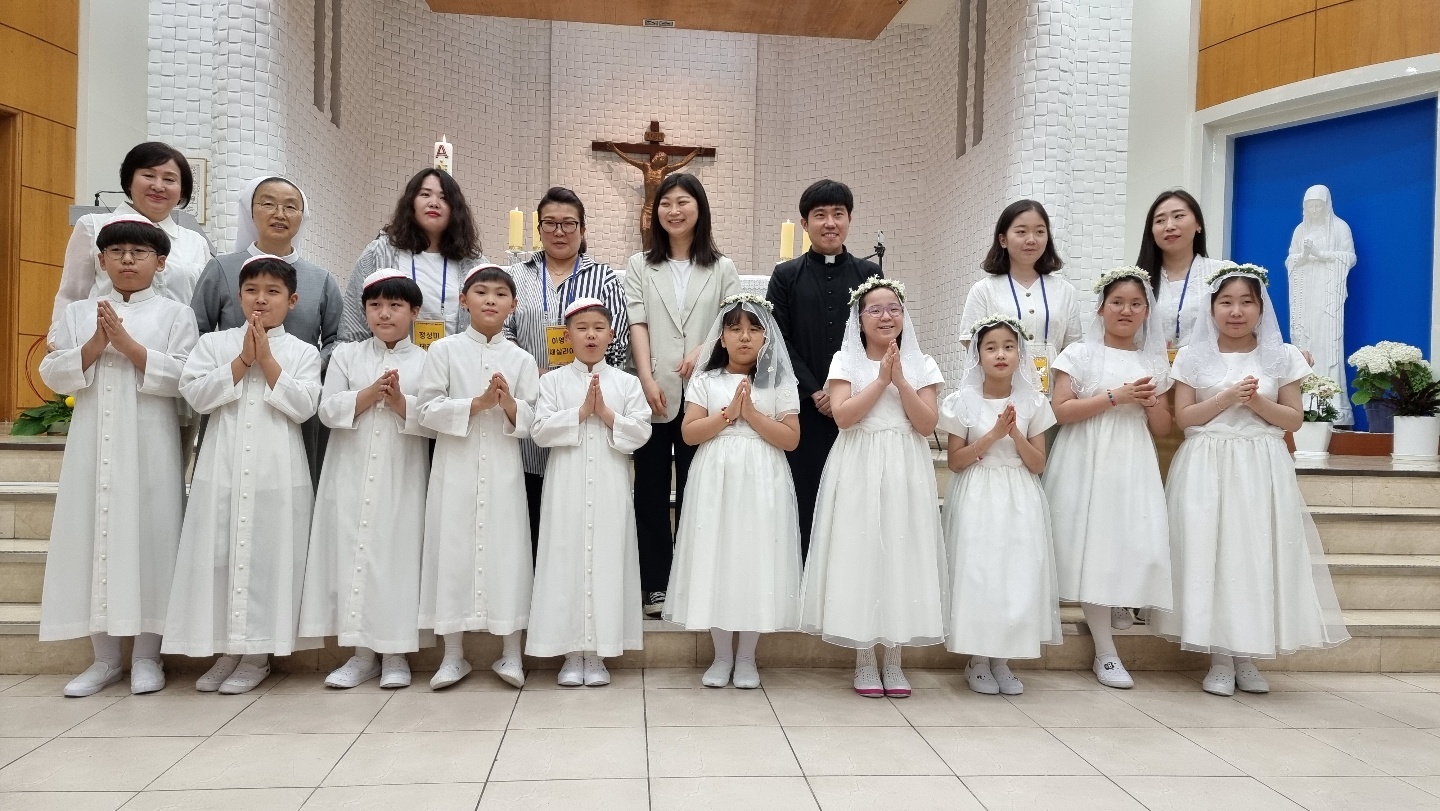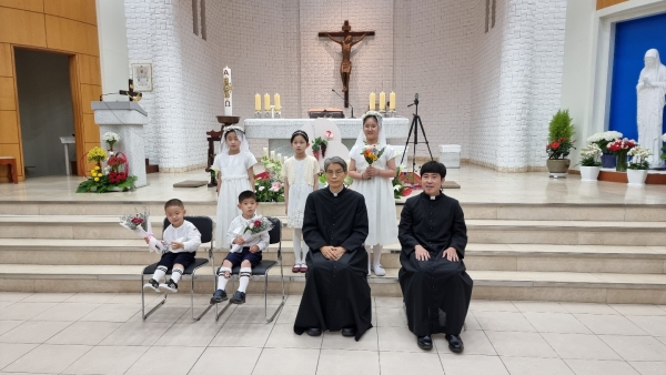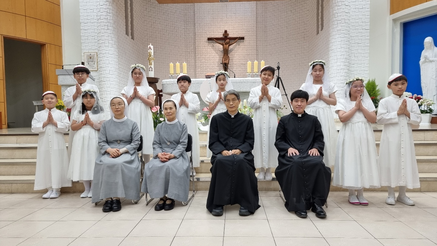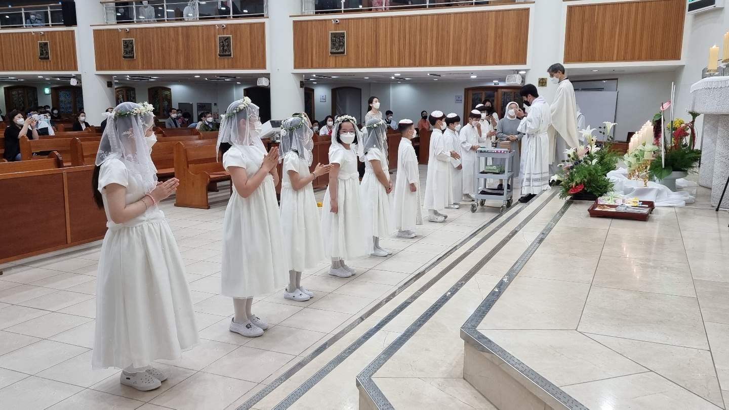 다음 교중미사중에 정월기프란치스코 신부님, 심현보 루카 신부님 두분의 집전으로 총 10명에 아이들 첫영성체식이 이었습니다.{ 천주교인들에게 영성체은 중요한 성사