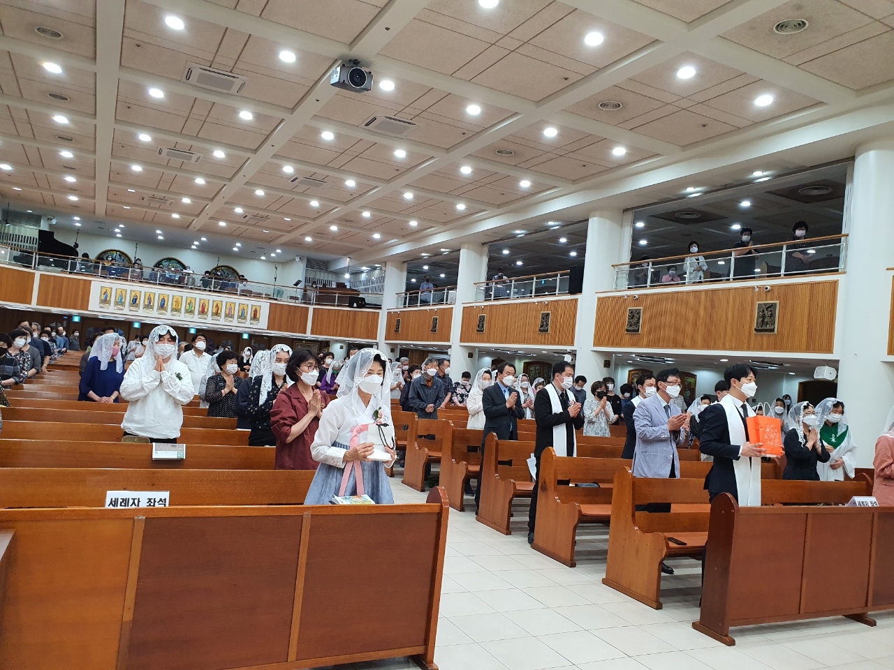 흰옷을 입힘 ,대부 대모 촛불전달식 서로 축하에 관한 권고 말씀 후 성모 삐에따스 성가대 특송 (주님은 언제나 내곁에 계셨네.) 이었습니다. 신영세자들 선물 증정식 후에 세례예식이 끝이났습니다.