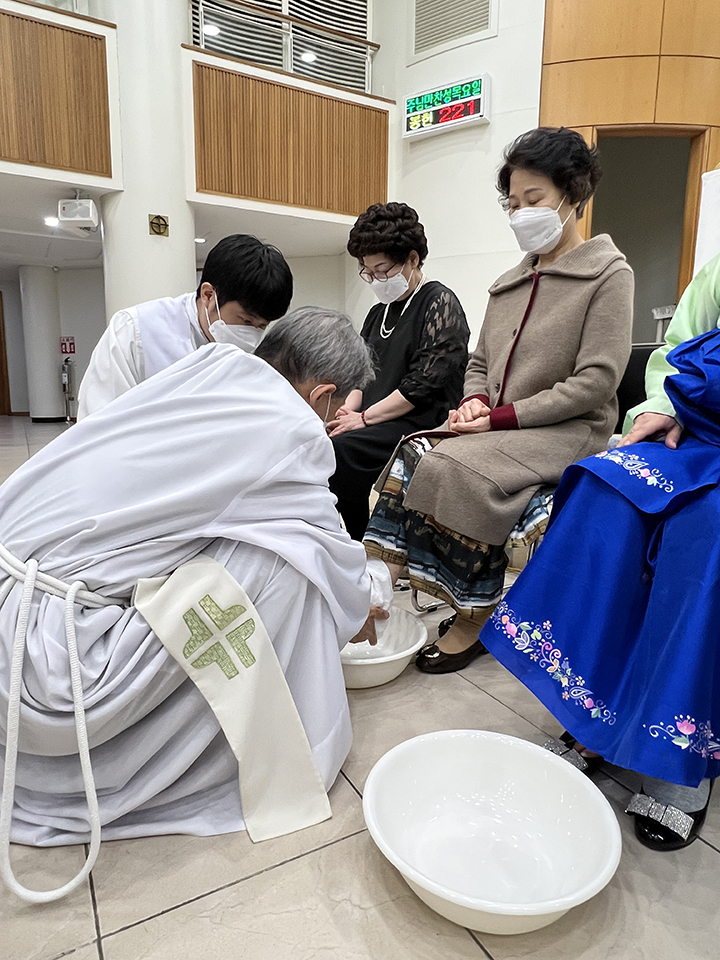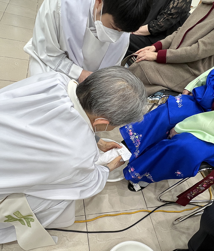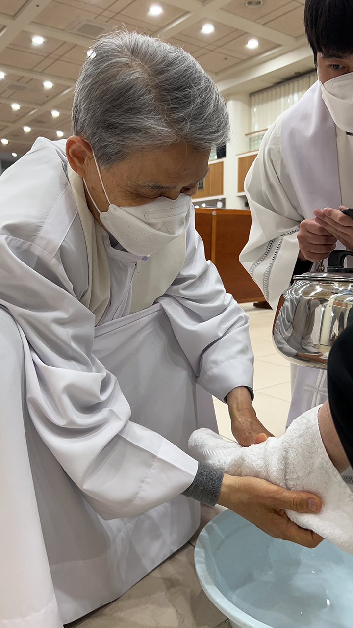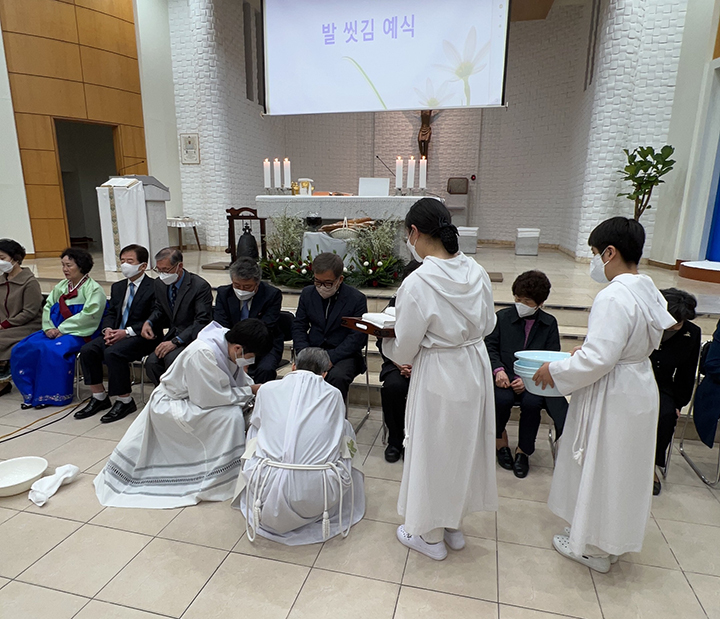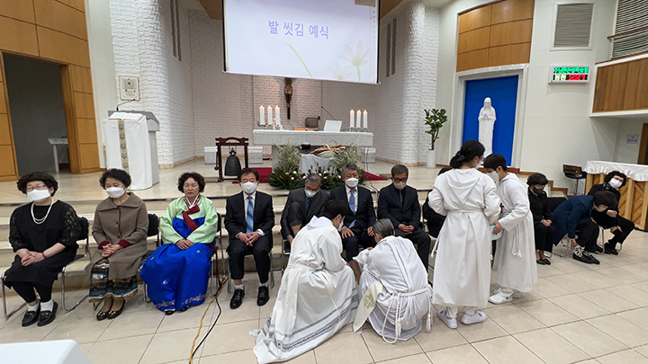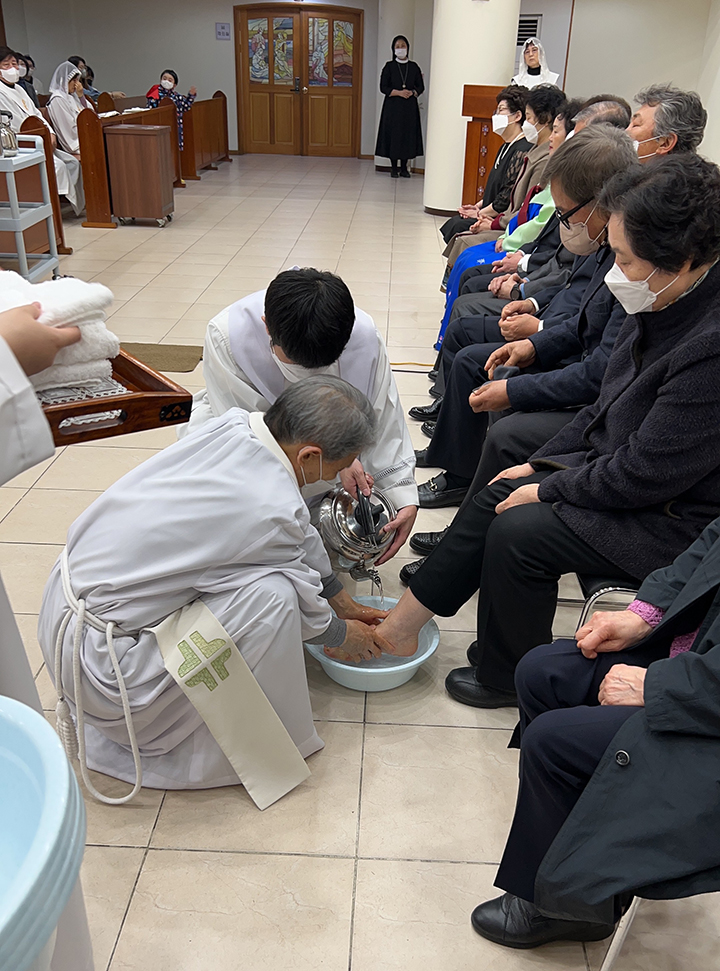 파스카 성삼일 - 주님 만찬 성 목요일 교회는 주님 만찬 미사로 '파스카 성삼일'을 시작합니다. 예수님께서는 당신께서 잡혀가시던 날 밤에 제자들과 함께 마지막 만찬을 하시면서 빵과 포도주의 형상으로 당신의 몸과 피를 하느님 아버지께 봉헌하셨습니다. 이 만찬에서 예수님께서는 몸소 제자들의 발을 씻겨 주시며 그들에 대한 크나큰 사랑을 보여주셨습니다. 이 미사에서 본당 주임 신부님 (정 월기 프란치스코) 께서는 각 구역장님들의 발을 손수 씻겨주시는 예식을 행하셨습니다. 너무나 정성스레 발을 씻겨주시는 모습이 보는 사람들로 하여금 가슴을 뭉클하게 만들었습니다. 예수님께서 모범의 표양을 보여주신 것처럼 신부님께서는 우리들에게 예수님 사랑의 실천을 보여주셨습니다. 예수님께서 우리를 사랑하신 것처럼 우리도 서로 사랑하며 살아갑시다.