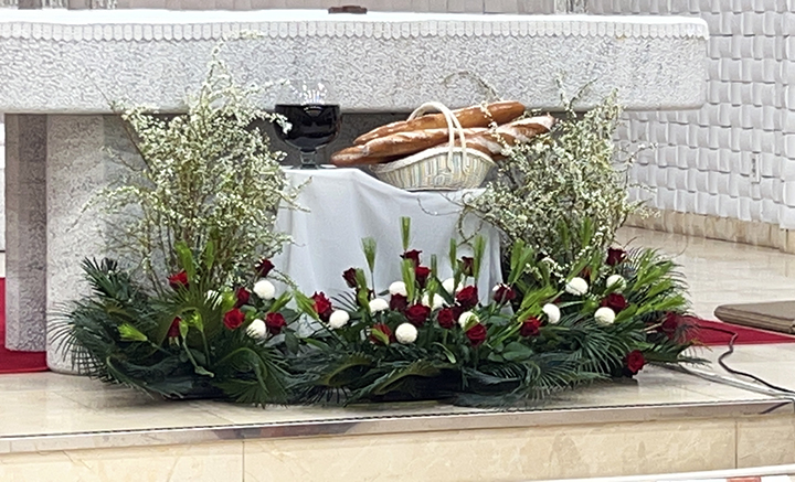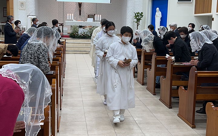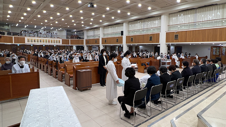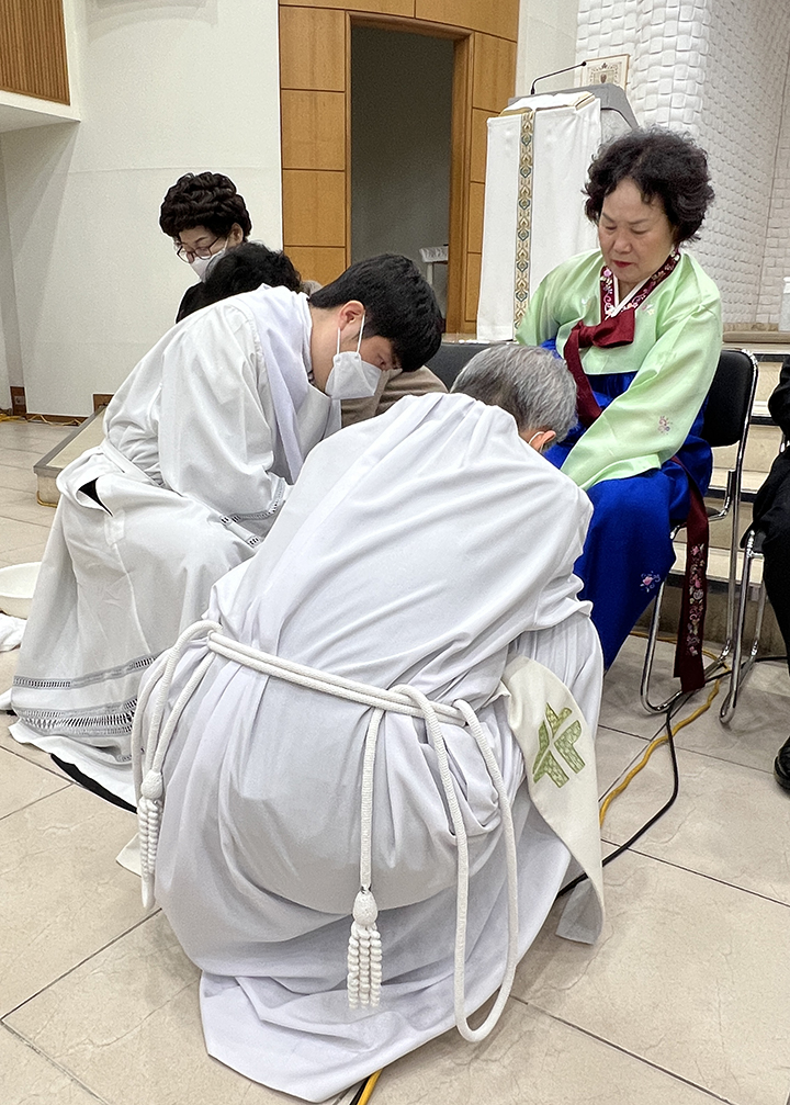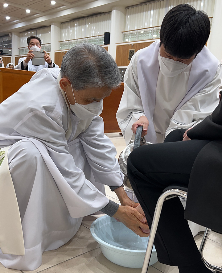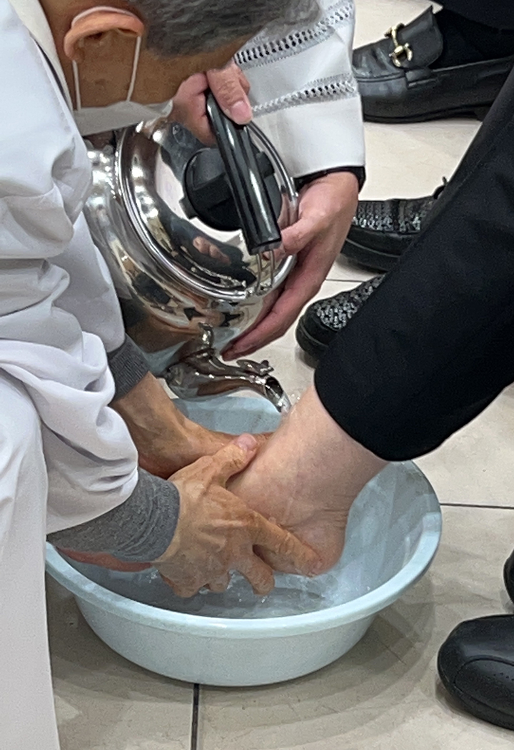 파스카 성삼일 - 주님 만찬 성 목요일 교회는 주님 만찬 미사로 '파스카 성삼일'을 시작합니다. 예수님께서는 당신께서 잡혀가시던 날 밤에 제자들과 함께 마지막 만찬을 하시면서 빵과 포도주의 형상으로 당신의 몸과 피를 하느님 아버지께 봉헌하셨습니다. 이 만찬에서 예수님께서는 몸소 제자들의 발을 씻겨 주시며 그들에 대한 크나큰 사랑을 보여주셨습니다. 이 미사에서 본당 주임 신부님 (정 월기 프란치스코) 께서는 각 구역장님들의 발을 손수 씻겨주시는 예식을 행하셨습니다. 너무나 정성스레 발을 씻겨주시는 모습이 보는 사람들로 하여금 가슴을 뭉클하게 만들었습니다. 예수님께서 모범의 표양을 보여주신 것처럼 신부님께서는 우리들에게 예수님 사랑의 실천을 보여주셨습니다. 예수님께서 우리를 사랑하신 것처럼 우리도 서로 사랑하며 살아갑시다.