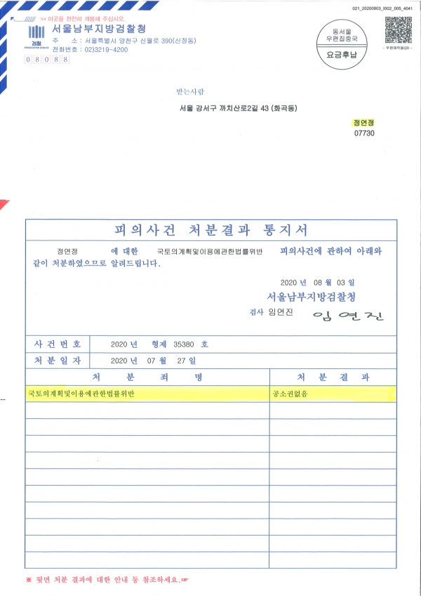 본당 영안실 ‘피고발건’에 관한 ‘검사처분’ 결과 (2020.7.27)